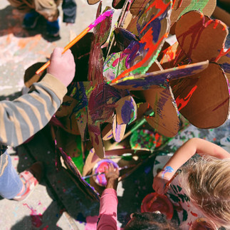 With recycled cardboard we cut out various abstract designs with our Makedo cutters. After hot gluing the pieces together we provided Colorations® fluorescent neon tempera paint, BioColor Metallic Paint, paint brushes #gifted from Discount School Supply and we invited the children to paint on this 3-D sculpture.