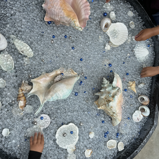 1. Invitation to Explore Seashells + Pearls: In a tuff tray we placed clear water beads mixed with Colorations Metallic Silver Paint to give it a pearl effect + seashells in different sizes & shapes for them to explore.