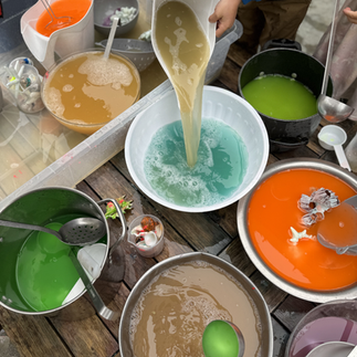 4. Sea Shell Soup: Mixed Colorations Fluorescent Paint with water + provided different containers, pots, pans, utensils, cylinders, bowls, & a variety of shells to create shell soup!