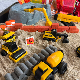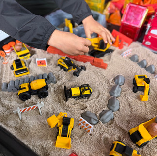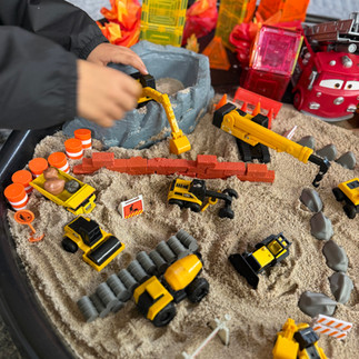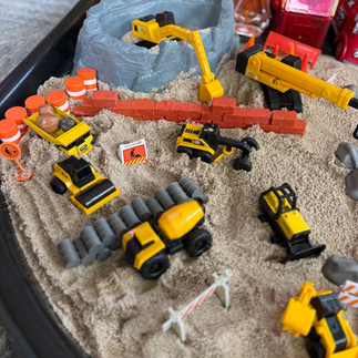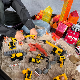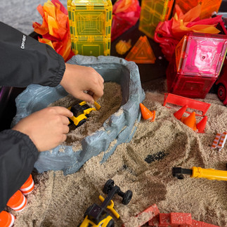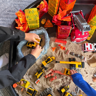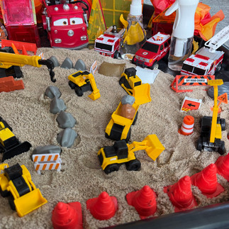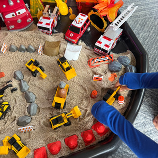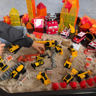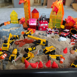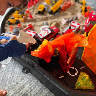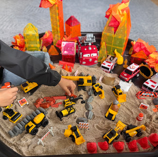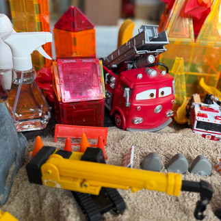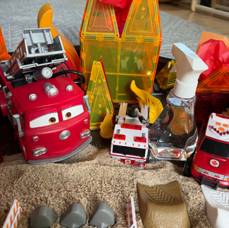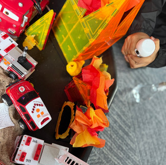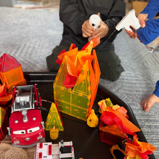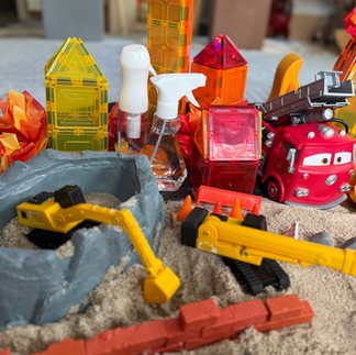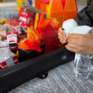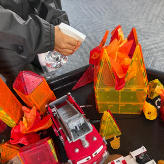 At Tinkerwonderplay, we love bringing stories to life through hands-on, imaginative play. To extend the experience of the book, we created a Small World Tuff Tray set in a bed of play sand, allowing children to fully immerse themselves in the scene. The tray included trucks and emergency vehicles, building blocks, cones, traffic signs, faux rocks, Way to Play roads, and Picasso Tiles transformed into “burning” buildings with tissue paper flames. Spray bottles added an interactive element, allowing children to reenact firefighting moments from the story.