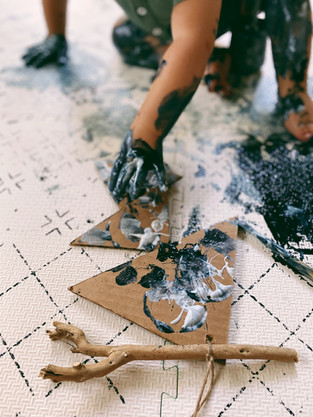 The materials you can use are limitless. From recycled materials, beads, string, paper, so on the options are open ended to whatever. For this mobile material we used cardboard, string, branches, and black + white tempera paint.