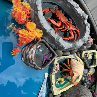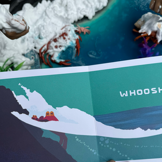 After reading this book we set out to recreate the story through sensory filled small world play in our tuff tray. We mixed water with Colorations shiny paint + liquid watercolors & corn starch to create an oobleck like texture for the water. Sprayed shaving cream to create waves. Provided crab figurines, fish, aquarium seaweed, coral, rocks, & seashells.