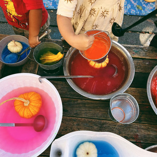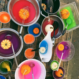 We've done fluorescent water play with flowers and exploring color theories, now we did it with pumpkins! To set this invitation we provided ladles, whisks, pots, bowls, buckets, a variety of clear containers, and a whole bunch of pumpkins/gourds from Smith Family Farm. Water was mixed with Fluorescent BioColor® and set up in the outdoor Mud Kitchen. The children were invited to create pumpkin soup!