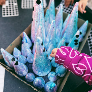 2. LOVE IS CALLING: The second infinity mirror room is darkened, mirrored room illuminated by inflatable forms that extend from the floor and ceiling, gradually changing colors. We invited the children to paint the sculptures followed by covering them in dots.