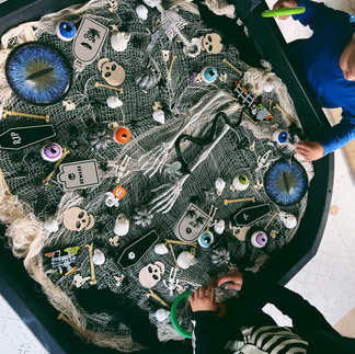 Read the I spy books as an introduction to provide exposure to the concept of the game. Set the invitation by placing a whole bunch of different halloween items or loose parts along with a magnifying glass. Invite the child to explore the materials or even play an i-spy game where you describe the item and have them use their magnifying glass to spot out the item!