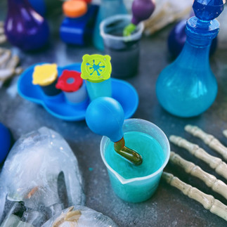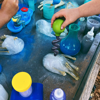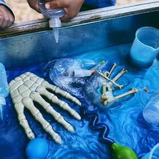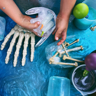 Freezing any type of toys, loose parts, or special ingredients always makes for a great way to explore science. We froze bones in gloves with water and provided magical potions mixtures to invite the children to experiment and explore how to excavate & release the phalanges from the ice.