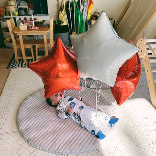Left over balloons from a party? Reuse them for Infant Balloon Gross Motor Play! All you need is helium filled balloons, string, play mat, and if you want to enhance the experience you can add in a mirror.