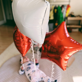 Strengthening gross motor movements where babies can improve those three different types of gross motor skills is a great way to keep babies engaged and help reach milestones. For this specific activity, with every kick and punch, leg and arm raise to move the balloons up & down + side to side, the baby develops their eye tracking ability, cause and effect, and concentration.