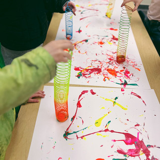 To create the body of the dragon we provided poster paper, Bio Color Colorations Metallic and Fluorescent Paint, and slinkies as their painting tools. The children were invited to paint with the slinkies and they were so excited to use an out of the norm tool. When a child uses a new tool to paint, their creative juices flow as they test and experiment a variety of new ways to paint. Through the process they also observe all the ways the slinky moves and bounces as it creates prints on the paper. It also makes for an interesting way for the child to experience how high/low/fast/slow the slinky moves when using their body ( fine + gross motor skills) to maneuver the tool. The whole process challenges the child cognitively and creatively to think and create in new ways all while having fun!