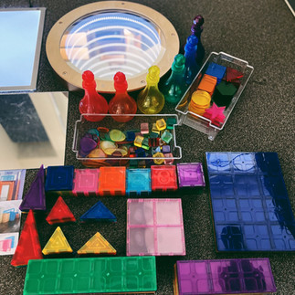 We invited the children to create something like Do Ho Suh. After looking at images of art, the children were provided Picasso Tiles, Translucent Pebbles, Gem Cubes, Excellerations® earlySTEM™ Translucent Light Table Shapes, and Colored Plastic Potion Bottles #Gifted. Since his exhibitions play with light, we also provided the Excellerations® Small Sleek Light Panel, Light Up Circular Infinity Mirror #Gifted, and Acrylic Mirror to build with or on.