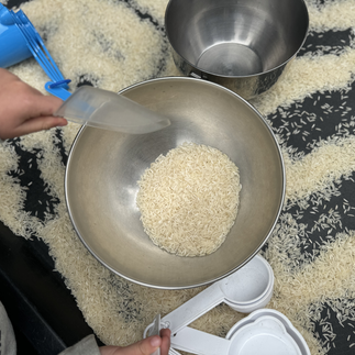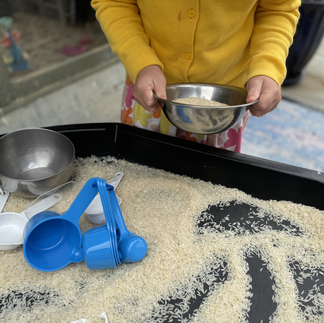 2.Rice Pouring Station// Rice is the world’s major staple meal. Around 80% of the world’s population, or more than 50%, depends upon rice for food. We set up a rice pouring station with bowls, measuring cups, & scoopers. The children were invited to imagine, create, & make some of their favorite recipes.