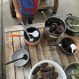 4. Invitation to Create Nature Soup// Inviting a child to create any type of sensory soup encourages so many levels of learning while they create. We invited the children to make their nature soup with foraged leaves, pine cones, water, pots, cooking utensils, & pitchers to create some yummy soup!