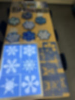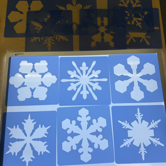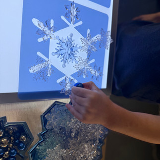 With this foundational knowledge, we set up a provocation using loose parts to invite the children to create their own unique snowflakes. The materials included acrylic ice cubes, iridescent acrylic rocks, and snowflakes, mini ice blocks, and gems in a variety of shapes. Snowflake stencils were placed on different bases, such as light tables and reflective, mirror-like plates, to inspire exploration and creativity.