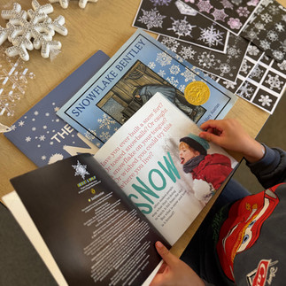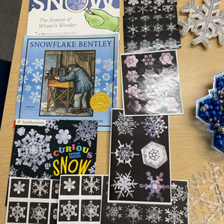 To integrate literacy and deepen their understanding of snow, we read Snowflake Bentley, Curious About Snow, and The Story of Snow. These stories helped the children explore the wonder and magic of snowflakes while supporting their comprehension through rich language and visuals. We also shared images of Bentley’s snowflake photographs, pointing out details and learning that no two snowflakes are exactly the same. The children discovered that snowflakes are six-sided, hexagonal shapes due to the molecular structure of ice, and while symmetry can occur, snowflakes are not always perfectly symmetrical.
