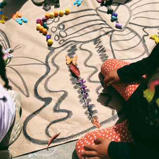 After reading the story we drew out the outlines of the life cycle of the butterfly on butcher paper and provided loose parts (wood bits, wood rounds, wood circles, translucent pebbles, grappats, translucent shapes, butterflies, foraged leaves/twigs/flowers) for the children to freely create on all the lines.
