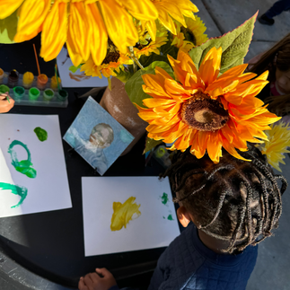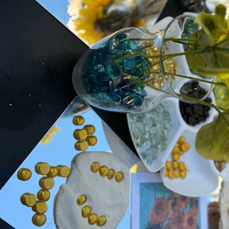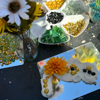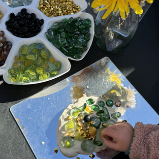2. Loose Parts + Play Dough Sunflowers: We set out vases filled with sunflowers image of his painting, playdough on acrylic mirrors, and a tinker tray filled with loose parts (flat marbles + acrylic rocks). The children were invited to create his sunflower painting in a 3-D way with the materials.