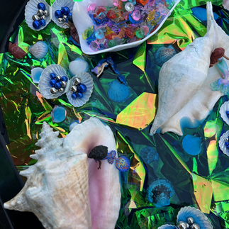 1. Seashell Mermaid Lagoon: In our Discount School Supply Tuff Tray we placed iridescent cellophane as the based, poured water + splashes of Colorations liquid watercolors. Provided mermaids, sea jewels, & seashells