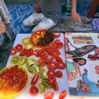 The story Tomatoes for Neela by Padma Lakshmi, illustrated by Juana Martinez-Neal that we got from Books Inc. is about Neela who loves cooking Indian food with her Amma (Mother) in memory of her paati (Grandmother). In the story she learns about all the different kinds of tomatoes they can pick from to make her paati's favorite tomato chutney sauce.