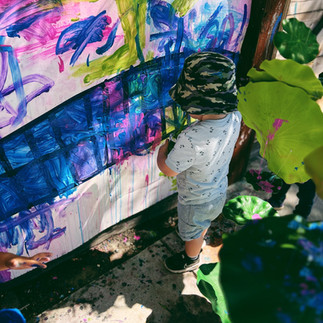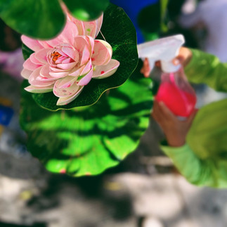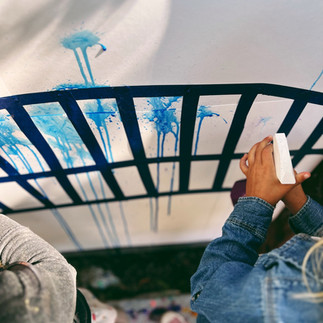 We stapled poster paper onto our fence and created a bridge with blue tape that was removed once the paint dried. From a tree we hung 3D waterlilies that the children could paint on. We provided spray bottles mixed with Colorations liquid water/bio color and later on we provided tempera paint as well. We invited the children to create & paint just like Monet!