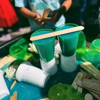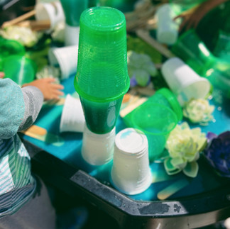 In our Discount School Supply Tuff Tray we set out flat marbles, plastic cups, large craft sticks, water lilies, water mixed with Colorations BioColor. The children were invited to build and create their own rendition of the paintings through STEM.
