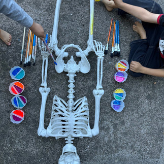 The sensory process with the paint + the 3-D Canvas with so many grooves/textures allows them to explore different techniques. They learn, explore, and experiment about color theory when mixing + creating new colors. And all this painting helps with the development of hand-eye coordination, strengthening the finger & hand muscles, and full body movement as they maneuver their body to paint the skeleton.