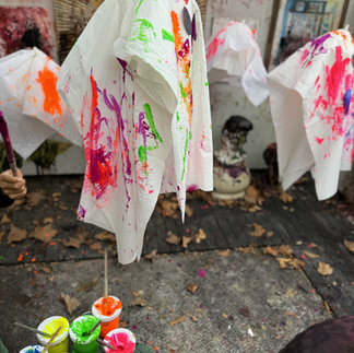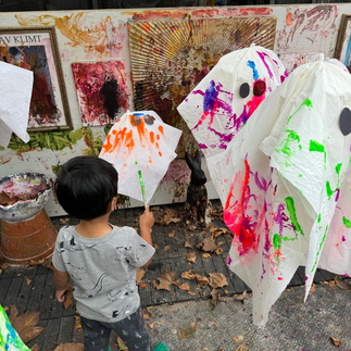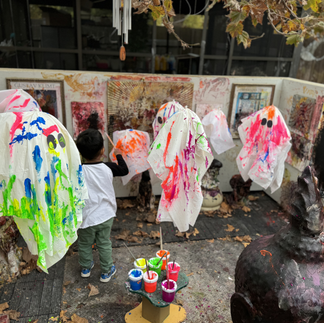 Spooky season is here and today we invited the children to paint floating ghosts which made for some fun filled action art and BOO-tiful creations! To set this invitation we filled our Discount School Supply paint cups with Colorations® Fluorescent Paint. The floating ghosts were made out of balloons, white paper tablecloths, and tied with fish wire to some branches on a tree. The children were invited the children to paint