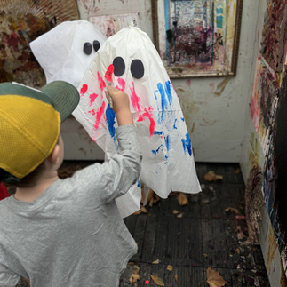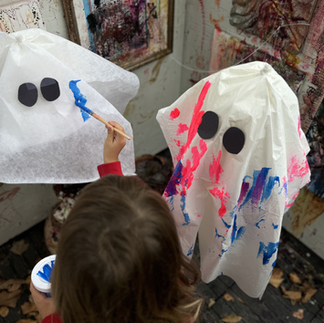All aspects of the painting process from gripping and re-gripping the ghosts to manipulate it to stay in place, painting all sides of the 3-D ghosts, balancing to reach in order to paint, standing upright, holding the paint cup in one hand while painting with the other gave the children an opportunity to be completely immersed in the process of creating while building and challenge so many physical and cognitive skills. Due to the ghosts hanging and not staying stationary, this activity was great for enhancing hand-eye coordination plus moving not only their hand but whole body to simultaneously accomplish the task of painting. This process also encouraged the children to use bilateral coordination, using both sides of the body at the same time, while each hand is performing its own task.