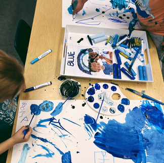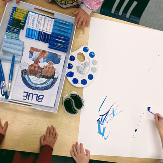 In the story a child describes all the beautiful shades of blue they feel while discovering that one has the power to change one’s many blues. Today after reading the story we invited the children to create with the many shades of blue. We provide liquid watercolors, bio color metallic and fluorescent paint, tempera paint sticks, markers, oil pastels, and crayons.