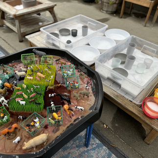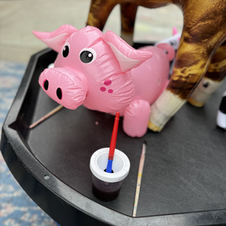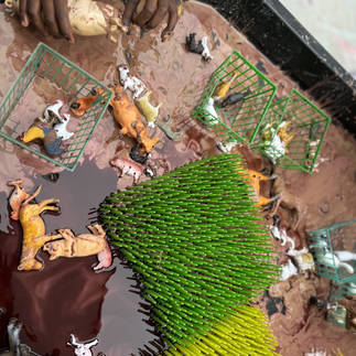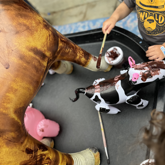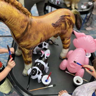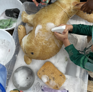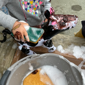 After the animals got dirty from head to toe the children were provided sponges, towels, scrubbers, toothbrushes, bowls, buckets, soapy water to clean all the mud off the animals. While there are endless benefits about sensory play (oobleck) & process art painting, washing the animals is a great way to have children be exposed to a practical life skill all through the power of play.