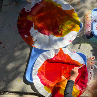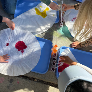 To inspire the children, we looked at images of her poppy paintings, poppy flowers in a vase, and discussed the colors and flowing shapes she used. The children were then invited to create their own poppy-inspired artwork using Texas snowflake coffee filters in a variety of sizes to represent layered petals. We provided pipettes and liquid watercolors in a color palette inspired by her work, reds, yellows, and oranges. As the children used the pipettes to drop color onto the filters, they watched the paint spread and blend across the paper, creating organic patterns that resembled flower petals.