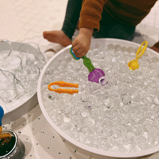 The first part of this invitation is letting the child explore and transfer the water beads to different size containers. As they transfer the water beads with the tools this provides opportunities for the refinement of hand-eye coordination and fine motor control. It allows a subtle and indirect preparation for writing by gently encouraging the hand to curl into the 'pincer grip' used for writing. Working with fine motor tools provides an engaging exercise which captures a child's attention and promotes attention to detail and sustained concentration. Transferring the waterbeads requires precise movement and helps in hand-eye coordination.