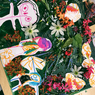One of our Artists of the Month is Kehinde Wiley, who is the African-American painter who is best known for portraits that feature African Americans in the traditional settings of old paintings with naturalistic brightly colored flowery backgrounds. After talking about who he is and his artwork along with looking at what he has created, we invited the children to do a Collaborative Canvas Collage. First the children were invited to paint layers of paint on a canvas. Next they were invited to draw portraits of people. Lastly they were invited to freely glue flowers and greenery around the portraits just like Kehinde Wiley.