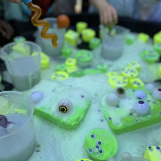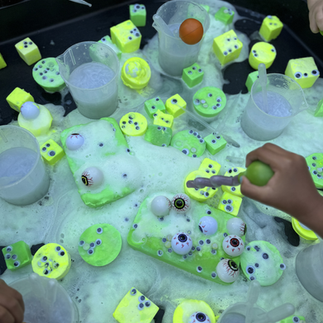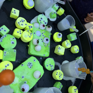 To create these magnificent monsters we mixed @armandhammer baking soda mixed with @colorations.artoflearning Fluorescent BioColors and Dawn Dish Soap in a bowl. Then we placed googly eyes and eyeballs on the bottom and top of the silicone ice molds and froze the mixture overnight. We placed the icy monsters on our tuff tray, provided @learningresources twisty droppers + pipettes & @heinz vinegar. The children were invited to create a mleting monster mash!