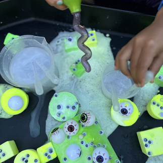 Through this invitation we learned all about chemical reactions through the magic of Melting Fizzing Monsters! As they experimented with the components the children experienced seeing & creating a chemical reaction. When baking soda (base) & vinegar (acid) are mixed together, one of the products this reaction creates is carbon dioxide gas. The carbon dioxide gas escapes, & that gas forms the fizz you see.
