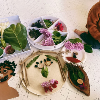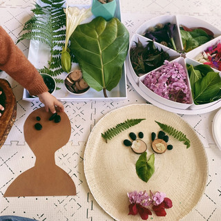 Next invite the child to create their own interpretations of a portrait of anyone with the natural loose parts they found in the nature walk on the face (paper, place mat, wooden cutting board, or paper plate) This type of activity stimulates children's thinking, to inspire them artistically, to empower them to take control over their learning, to open their minds, to create an environment for reflection, to challenge children, and to encourage creativity. They are able to understand their own interpretations of faces and become more aware/familiar of body parts in an open ended way.