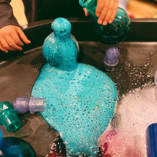 Place a base of baking soda, dish soap, glitter/confetti into the containers. Place liquid watercolors and vinegar into cups and provide droppers. Invite the child to explore and create fizzing sparkly potions. Through this process they learn about color recognition, cause and effect, chemical reactions, and scientific theory all through open-ended inquiry based learning.