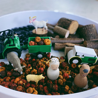 To set this invitation you will need a sensory bin or tray. Farm life animal figurines, wood rounds, natural blocks, rocks, pumpkins, farm mobile vehicles, faux pumpkins, and mini scented pumpkins.