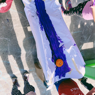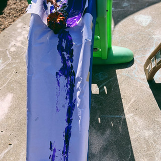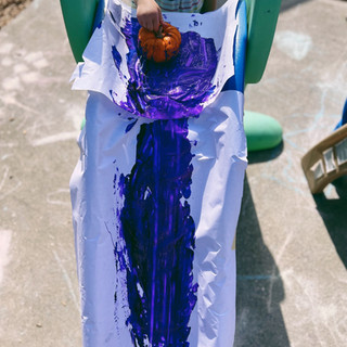 The juxtaposition of art materials on playground equipment makes for rich memorable experiences that prompt children to see things from our everyday experiences in a new light. We took our pumpkins, Colorations Tempera Paint, Butcher Paper and Slides to create this STEAM invitation to explore action art. With taped butcher paper on to the slides we placed puddles of paint on the top of the slide, and invited the children to experiment pushing the pumpkins down the slide.