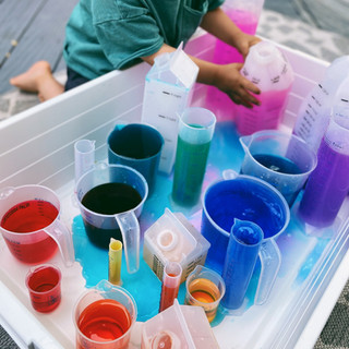 To set this invitation you will need a sensory bin, Learning Resources Gallon Measuring Set , Graduated Beakers, Graduated Cylinders, Liquid Measures #gifted, water, liquid water colors or food coloring. Invite the child to pour, scoop, measure, and mix, in the sensory bin.