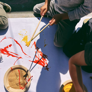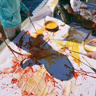After reading the story we invited the children to use chopsticks and yarn to paint with "ramen noodles" on paper. We provided butcher paper, paint, chopsticks + yarn & invited the children to pick up the "ramen noodles" with their chopsticks, dip it in the paint, & create it uniquely just like Hiro did in the story. Using chopsticks can be tricky for children to master, but they often come up with their own creative ways of using them.