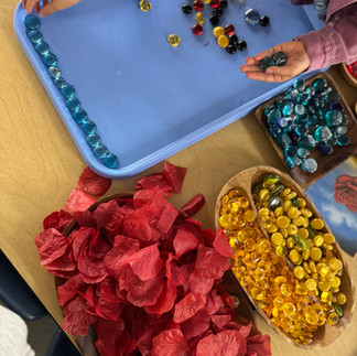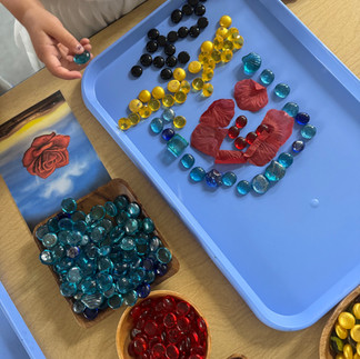 3. Invitation to Create: Meditative Rose with Loose Parts: For our final exploration, the children reinterpreted Dalí’s “Meditative Rose” using loose parts as their medium. Presented with the painting and materials that matched its color palette — flat marbles, gems, petals, and a blue tray as the base — the children arranged and designed their own transient art pieces. This open-ended process invited mindfulness, creativity, and reflection, echoing Dalí’s ability to find beauty in simplicity and symbolism.