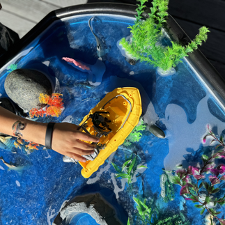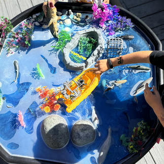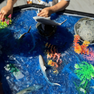 After reading the inspiring story Shark Lady: The True Story of Eugenie Clark Became the Oceans Most Fearless Scientists by Jess Keating, we set up a small world play invitation. In our tuff tray we placed Colorations Shiny Tempera Paint to make magical water, shells, aquarium seaweed, sharks, & a scuba diver + the gear. The children were invited to explore in the ocean & sharks just like Eugenie.