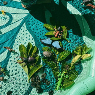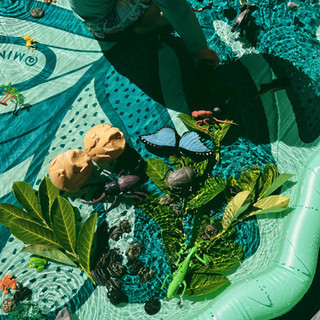 For this small world play we used our the Mini Dip Tropical Palm Leaf Splash Pad, rocks, leaves, and some jungle animals.