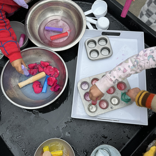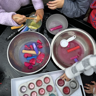 Emergent math +science skills + problem solving/critical thinking are practiced as children experiment, make comparisons, solve problems, test theories, make mixtures/recipes, observe different concepts, measure & count ingredients for their mud pies. This is the scientific process in action!