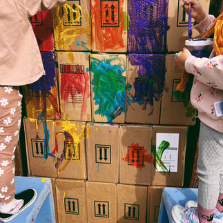 rows of rectangular recycled cardboard boxes. Provided tempera paint and brushes. The children were invited to paint just like Alma.