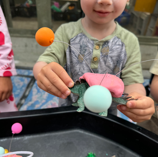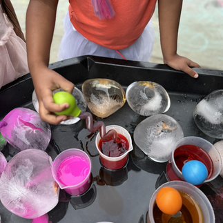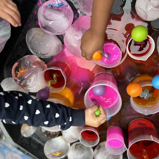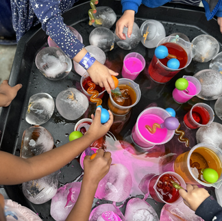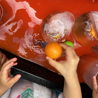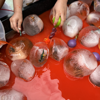 We froze dinosaurs in balloons with water and provided water mixed with liquid watercolors + twisty droppers. The children were invited to experiment and explore how to excavate & release the dinosaurs from the ice.