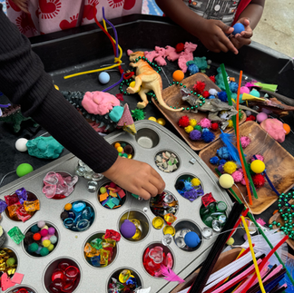 We invited the children to create their own dinosaur party with playdough + loose parts. In a cupcake tin we placed pom poms, gemstones, acrylic rocks, flat marbles, rainbow wooden squares, sequins, mosaic tiles, feathers, pipe cleaners, & party beads. We also provided balloon cake toppers, mini party hats, + playdough. The children were invited to create whatever they desired.