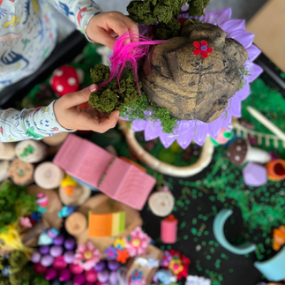 To set up this Trolls Village, in a Tuff Tray I placed rock blocks, natural blocks, dyed rice, acrylic rocks, grappat loose parts, moss, felt flowers, trolls figurines, fairy house, grimms coral reef + rainbow, and mushrooms.
