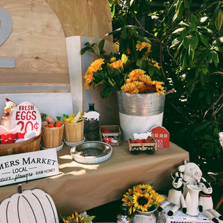 The base of the backdrop was the actual “Farmers Market.” Crates of farm animals, farm trucks, baskets filled with veggies + fruits play food, and farmers market flowers . The signs are all linked here (Farmers market, Fresh Eggs, Flowers, Lemonade.)
