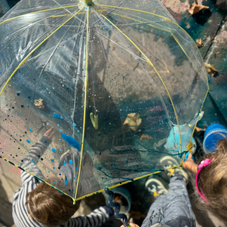 2.Invitation to Paint Rain on Umbrellas: We hung umbrellas to float from branches & placed some on the ground. Provided water mixed with Colorations Paint (Liquid watercolors + BioColor) + placed Learning Resources Twisty Droppers + Pipettes as the painting tools. The children were invited to squirt, drip,explore, experiment, & create rain on the umbrellas.
